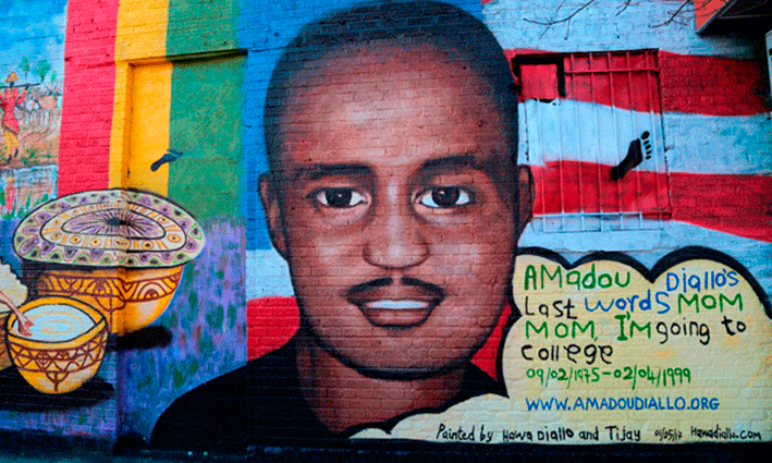 Tras años deteriorado, el pasado enero se restauró con una nueva imagen este mural en memoria de Amadou Diallo, que murió en 1999 tras recibir 41 disparos de agentes de la Unidad de Crímenes Callejeros del Departamento de Policía de Nueva York.