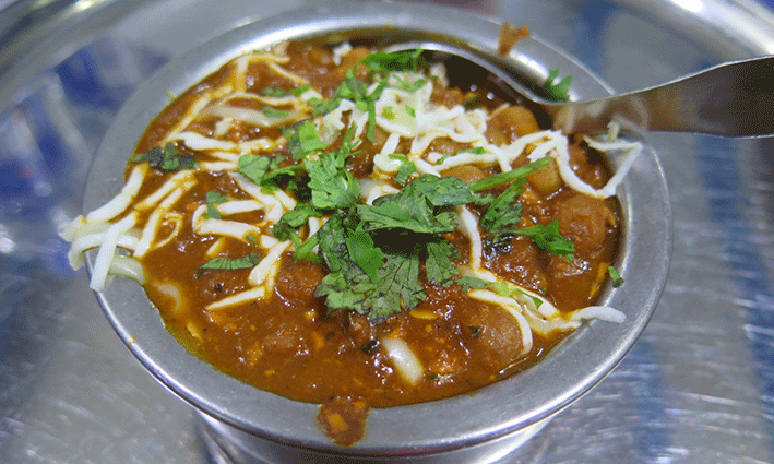Se trata de un guiso de garbanzos (chana), cebolla, el tomate, cúrcuma, ajo, jengibre, guindilla y especias masala que se corona con unas hojas de cilantro. La pura esencia de la India en un bocado.