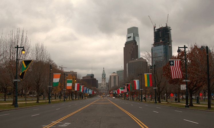Justo enfrente del museo, veréis una amplia avenida que llega hasta el Ayuntamiento. Vosotros sólo la recorreréis hasta Logan Square, pero será suficiente para ver las banderas de todos y cada uno de los países del mundo. Seguiréis por Vine St hasta dar con la calle Broad.