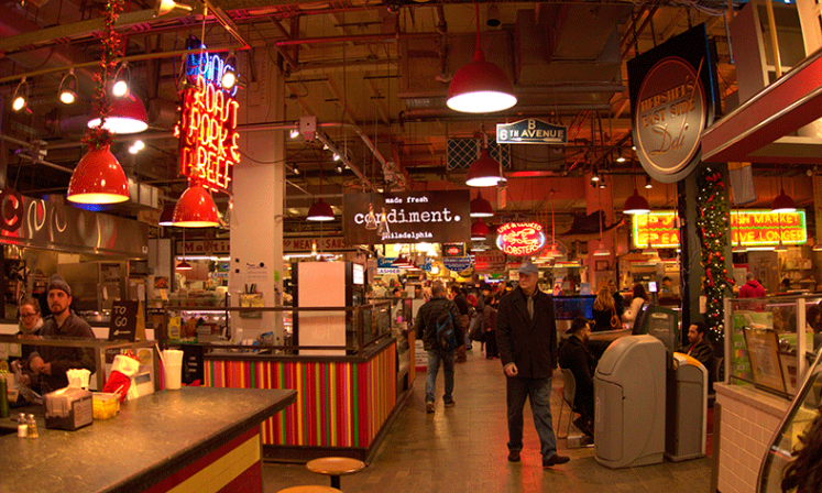 Atravesando el patio interior del Ayuntamiento, os incorporaréis a Market St. En el cruce con 12th St encontraréis el Reading Terminal Market.