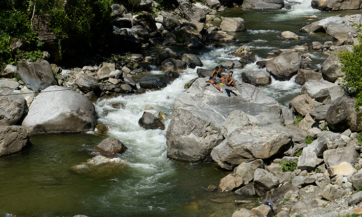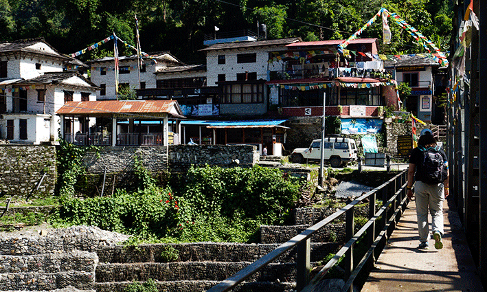 En fin, estábamos allí y había que comenzar a sacudirse todos los problemas y disfrutar. Eran las 8:40 de la mañana. Bajamos andando al pueblo de Birenthanti, hasta donde se puede llegar también en coche, pero desde Nayapul es solo bajada. Allí hay algunas tiendas, incluso una de móviles que no nos dio mucha confianza…. pero lo importante es pasar por la oficina de registro. En la primera pedirán en TIMS y os apuntarán en un cuaderno. Luego se cruza el primer puente y allí, en la segunda, os solicitarán el ACAP.