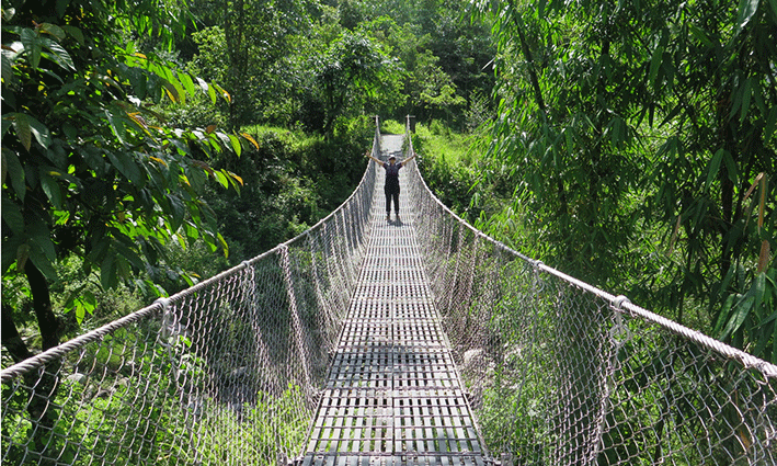 Nos metimos por senderos más estrechos, atravesando vegetación, riachuelos y puentes colgantes. El entorno era realmente bonito.