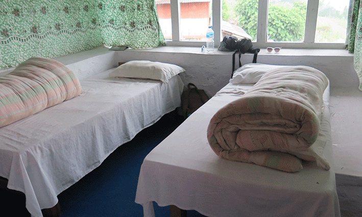 Coincidimos en la llegada con los italianos y nos alojamos en el primer hostal del pueblo, a la derecha: Super View Guest House y aquí pusimos en práctica un truquito: Nos pidieron 400R por habitación doble (muy básica y con baño compartido) y yo le pregunté que si cenábamos y desayunábamos allí nos la dejaba gratis. Dijo que sí, pero que no se lo dijera a otros huéspedes. 400 R de ahorro, que en España no es nada pero en Nepal eran el contundente desayuno de los dos. Además hay que tener en cuenta que la comida y la bebida en la montaña son más caras cuanto más se sube.