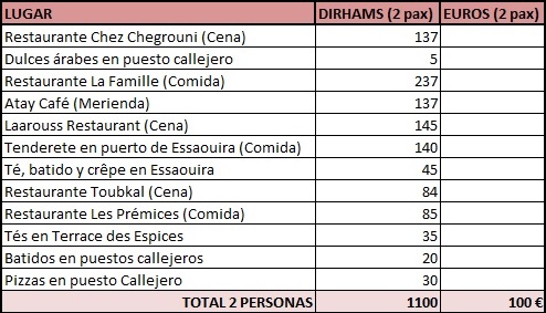 Es la partida en la que menos suelo escatimar viajando porque me encanta. Combinamos lugares más de moda y “de postureo” como el Atay Café o La Famille, restaurantes más tradicionales dentro de zonas turísticas, como el Toubkal y Chez Chegrouni, y puestos callejeros. Este fue el resultado: