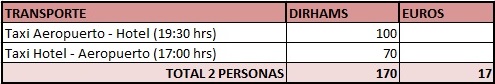 Con todo esto, los únicos transportes que cogimos fueron los taxis del aeropuerto. En nuestra llegada podríamos haber ido en autobús hasta el centro por 30 Dirhams cada uno, pero por 100 en total preferimos que nos dejara en la puerta del hotel. A la vuelta, el mismo trayecto lo conseguimos por 70 Dirhams. El total por persona sería de 8,5€.