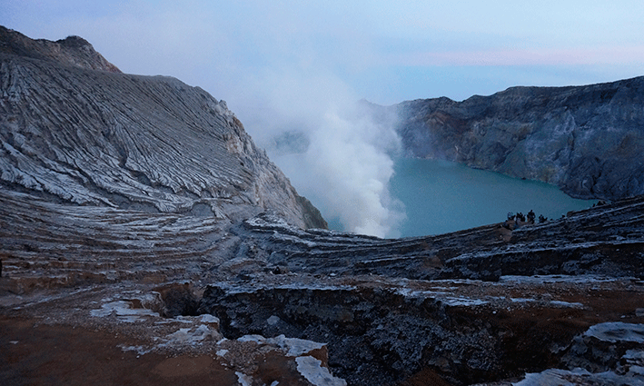 Iluminados por la luna principalmente, fuimos de los primeros en llegar al borde del cráter y comenzamos el descenso por el farragoso camino hasta el interior para ver el fenómeno del fuego azul, algo único en el mundo. Regresamos arriba y esperamos a ver el amanecer antes de descender de nuevo a la base. una vez estuvo reunido el grupo, regresamos cada uno a sus hoteles en el Jeep.