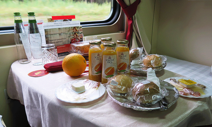 A las 7 de la mañana, la azafata llamó a nuestra puerta para despertarnos; en unos minutos nos servirían el desayuno. Nos vestimos y nos trajeron para cada uno dos naranjas, zumo, agua, café, leche, una tabla de quesos con frutos secos, penecillos y lo que habíamos pedido la noche anterior del menú caliente: unos crepes y un porridge con melocotón. Estaba todo de 10. Así, llegamos a la estación de Leningradskaya en Moscú con la melodía “Himo a una gran ciudad» de fondo a las 7:55, poniendo punto y final a este inolvidable trayecto.