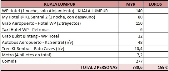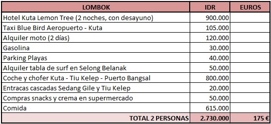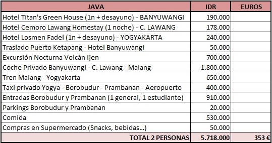 En esta ocasión, en lugar de dividir los gastos por partidas lo he hecho por destinos. Durante mi viaje de 3 semanas (18 días completos y 2 de viaje) visité la ciudad malaya de Kuala Lumpur, que utilicé como puerto de entrada a Asia, Lombok, Bali, Flores y Java. Los precios y actividades varían ligeramente de un destino a otro, y como no todo el mundo incluye las mismas zonas en su viaje Indonesia, he decidido realizarlo así para que se pueda tener una referencia más concreta.