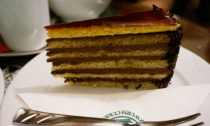 Terminamos la ruta con un postrecito, pero no cualquiera, sino la tarta favorita de la mismísima Sissi Emperatriz. Se dice que cuando estaba en Budapest, se pasaba con frecuencia a la cafetería Ruszwurm, cerca del Bastión de los Pescadores en la colina de Buda, a por un trozo de su tarta favorita: Dobos Torta. Se trata de 5 láminas de esponjoso bizcocho y crema de chocolate recubiertas con caramelo. Es un “must” de la ciudad por este motivo, pero aunque está buena, a mí personalmente me gustó más la milotai mézes grillázstorta, de miel, nueces y caramelo.