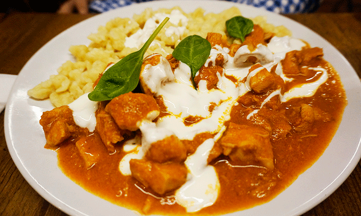 El pimentón (paprika) es un ingrediente muy usado en el centro-este de Europa y en Hungría concretamente son varios muy comunes que tiran de él. Comenzamos con el pollo paprika, para el se cocina a fuego lento taquitos de pollo, cebolla picada, ajos, tomate y pimentón al que finalmente se añade crema agria, quedando una salsa deliciosa. Normalmete se acompaña de nokedlik, una pasta tipo gnoccis aunque más bien por aspecto parecen palomitas de Risi. Un plato contundente pero delicioso.