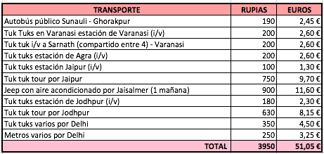 Visitamos las ciudades de Varanasi, Agra, Jaipur, Jaisalmer, Jodhpur y Delhi y, dentro de ellas, los puntos de interés más famosos, algunos gratuitos y otros de pago. Aquí el desglose de lo gastado entre los dos: