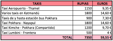 En Katmandú y alrededores nos movimos siempre andando o en autobuses y furgonetas públicos, aunque sí que cogimos algún taxi para llegar desde el aeropuerto o cuando ya se nos había hecho tarde. También usamos taxi privado desde Pokhara a Nayapul y desde Kimche a Pokhara, los puntos de inicio y fin del trekking.
