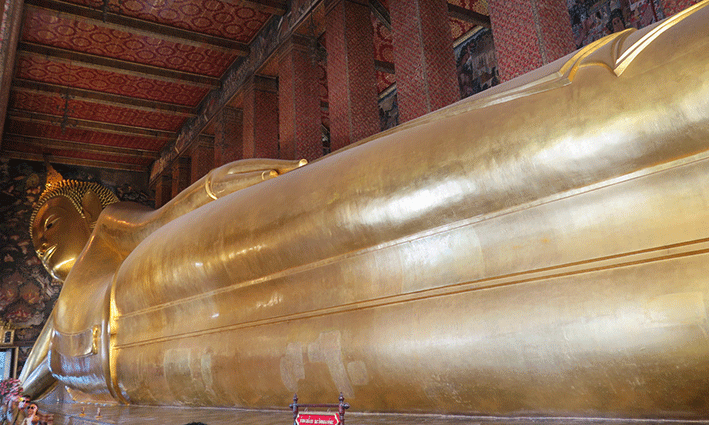 A pocos minutos andando del Palacio Real está Wat Pho, el templo del Buda Reclinado. Con 46 metros de largo y 15 de alto, es la figura más grande de Tailandia y, por supuesto, una visita que no os debéis perder en Bangkok. Pero no solo de esta magnífica estatua vive el templo, también encontraréis peculiares estupas decoradas con azulejos de colores, infinidad de figuras de buda, un enorme gong y la Escuela de Medicina Tradicional y de Masajes, donde podréis disfrutar de uno a un módico precio.