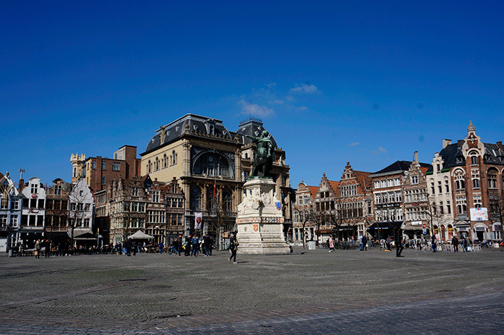 Destacan las dos estatuas en el centro de la plaza, una en honor a Carlos V y otra a Jacob van Artevelde, que contribuyó con sus sabiduría a solucionar problemas comerciales con Inglaterra y convertir a Gante en la ciudad próspera que fue.