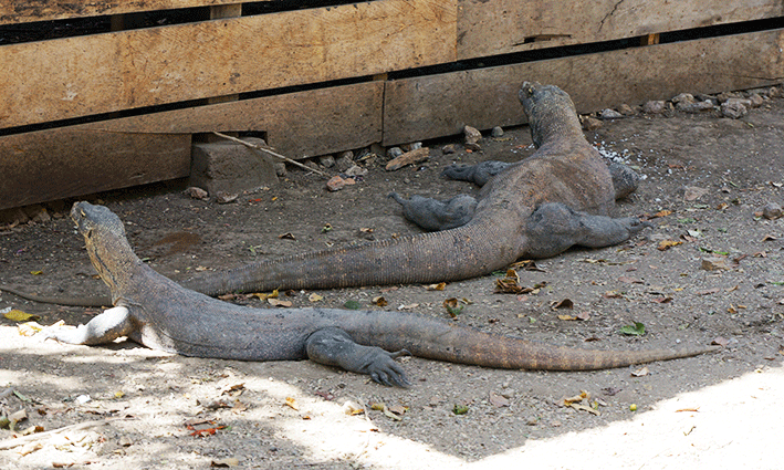 Finalmente sorteamos el peor tramo y atracamos casi una hora después en la isla de Padar, no sin antes cruzarnos con un par de delfines por el camino, para que os hagáis una idea de dónde estábamos. Subimos andando a lo alto de la isla y disfrutamos de las magníficas vistas que tanto había soñado experimentar en primera persona, pero mentiría si dijera que la experiencia anterior no empañó la sensación. Estaba más preocupada por camino de vuelta que de disfrutar del momento. Por el mal estado del mar, ese día no era posible para ningún barco llegar a Komodo, así que los chicos del barco reorganizaron el itinerario enseguida. Nos perdíamos Komodo, Pink Beach y Manta Point, que dadas las circunstancias no nos importó, y nos encaminamos hacia Rinca. El trayecto tuvo algo de movimiento y algún que otro momento tenso, pero no tanto como a primera hora ya que no era tan a mar abierto. Llegamos a Rinca y ahí si que ya más tranquilos, disfrutamos mucho de la vista. Hicimos un trekking corto acompañados del ranger, que nos contó todo tipo de curiosodades de este peculiar animal y vimos varios ejemplares, incluyendo uno de los más grandes de la isla. Fue una suerte, porque al estar en libertad nunca te aseguran verlos, pero a unas malas siempre suele haber alguno cerca de la caseta de los vigilantes por el olor a comida.