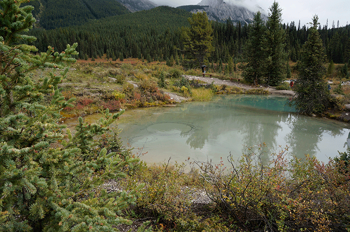 Sabiendo que el día iba a estar lluvioso hasta bien entrada la mañana, aprovechamos para descansar y hacer de nuevo la compra en el supermercado. Cuando escampó, fuimos en coche hasta Johnston Canyon e hicimos el trail que recorre todos sus pentes, un recorrido sencillo pero que nos gustó mucho. Desde el último, enlazamos con el trail The Inkpots, no muy exigente pero bastante largo, eso sí, lo que vimos allí nos pareció super peculiar: una especie de burbujeantes jacuzzis naturales de agua cristalina.