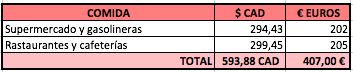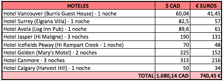 En total gastamos 740€, es decir, 370€ por persona, lo que está fenomenal en un país como Canadá.