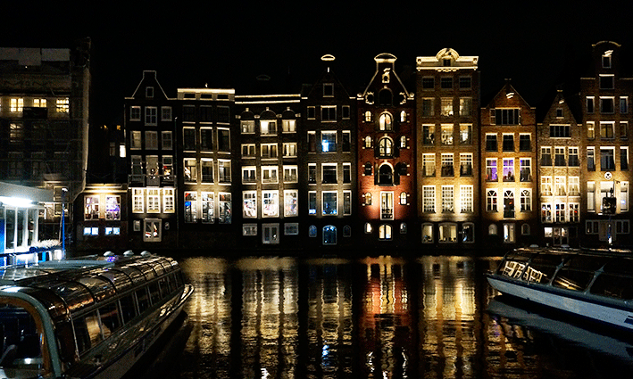 Mi estampa favorita de la ciudad es sin duda Damrak, nada más salir de la estación central a la izquierda: Un conjunto de casas holandesas flotando sobre el canal que incluso gana de noche con el reflejo en el agua.