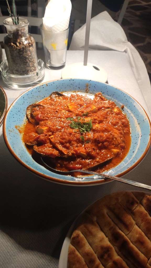 Langostinos y mejillones Saganaki (Taberna Yiannoulis, Paros – Grecia)