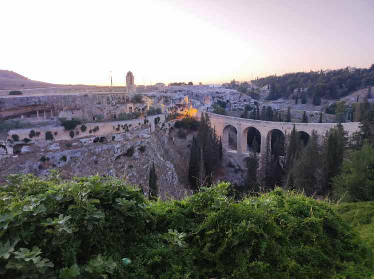 Recogimos el coche en Nápoles hacia las 15:00 e iniciamos un largo camino por carreteras secundarias para evitar peajes hasta llegar a la provincia de Basilicata. Allí vistamos el acueducto del pueblo Gravina in Puglia, que, al igual que la ciudad de Matera, sale en la película de James Bond “Sin tiempo para morir”. Nos hacía ilusión.