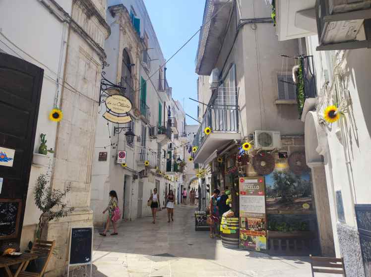 Polignano a Mare: En la línea de Monopoli pero aún con más gente. Siendo un pueblo costero muy conocido y en pleno agosto, no podía ser de otra manera. Paseamos por todo el centro histórico, un gran tramo bajo carteles de luces con la letra de la canción “Volare”, ya que su autor, Domenico Modugno, es natural de allí. Otro paseo que recomiendo es bordear la costa y asomarse al mar desde los distintos miradores, que nos regalarán las estampas más típicas del lugar.