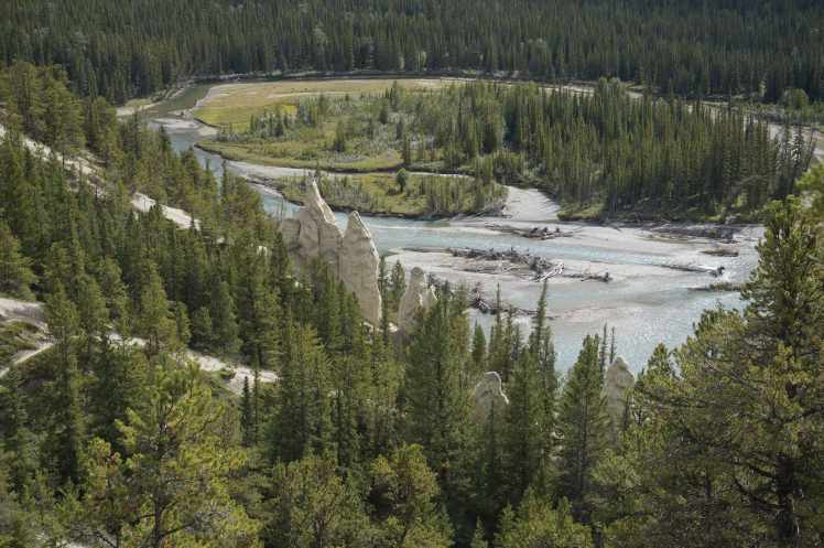 Los hodoos son las formaciones que en España conocemos como “chimeneas de hadas”. Cerca de Banff hay un conjunto famoso al que se puede llegar de dos maneras: Caminando desde Bow Falls en una ruta de 9,5km i/v llamada “Hodoos Trek” o en coche hasta un mirador situado en Mirador Tunnel Mountain Road.