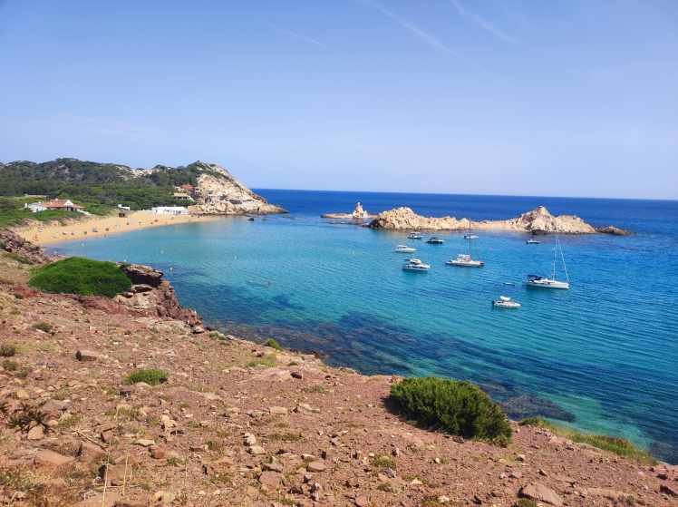 Para empezar hay que caminar media hora por un paisaje de aire volcánico con arena rojiza desde cala Binimel-là, con alguna que otra subida rocosa. Cuando llegas, desde lo alto la imagen es idílica y salvaje, con arena más dorada y agua limpísima.