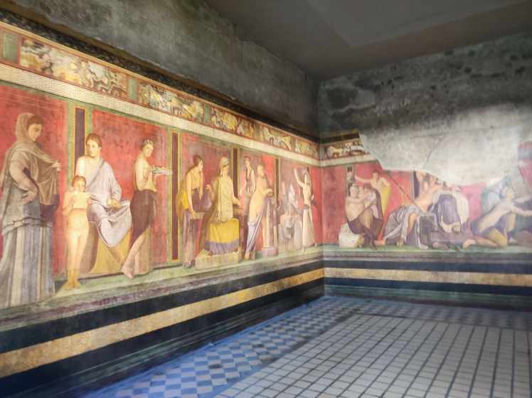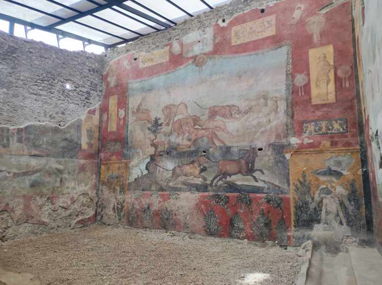- Villa de los Misterios: Lo mejor del complejo y sólo accesible si se adquiere la entrada completa. Las pinturas en paredes tienen un estado de conservación excelente y también mantiene algunas puertas y postigos de ventanas. Es importante recordar a la hora de planificar la visita que cierra una hora y media antes que el resto del complejo y está algo retirada.