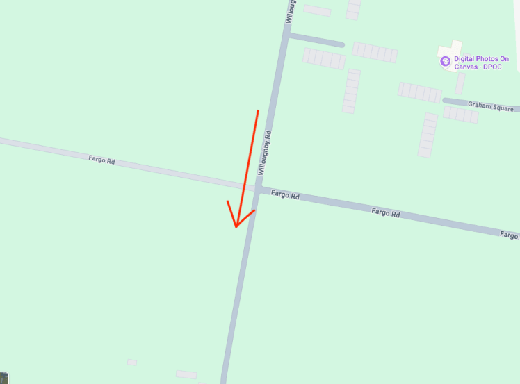 Concretamente hay que buscar el cruce entre Fargo Road y Willoughby Road. En esa última cerca del cruce entre ambas, hay zona para aparcar. Después, hay que seguir andando por Willoughby dirección sur, de frente al cartel de la foto y luego dejándolo de eslpaldas, por donde indica la flecha del mapa. El camino empieza asfaltado y luego sigue de tierra.